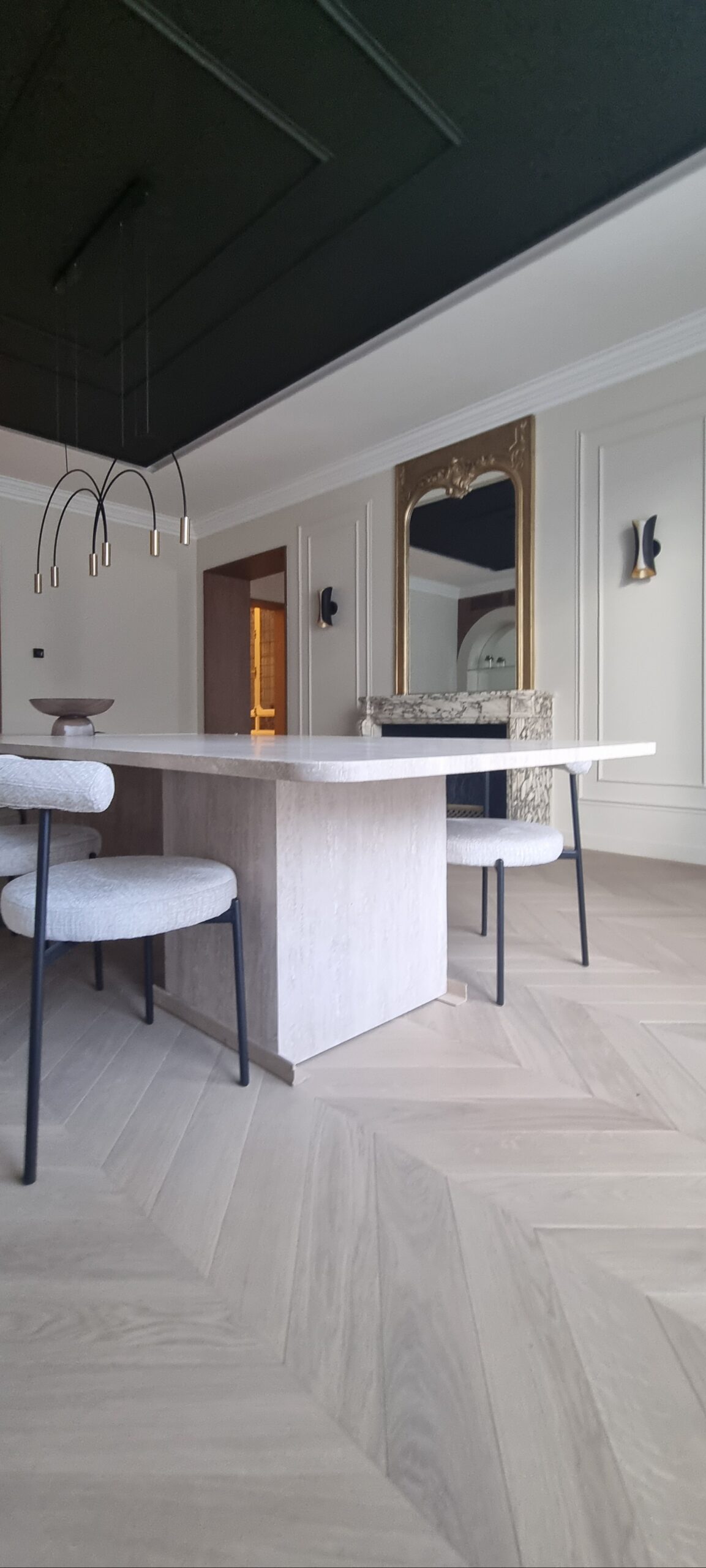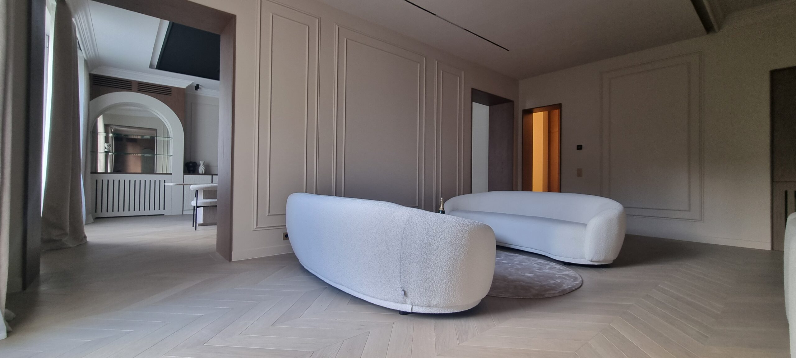 Dans ce très bel espace, avenue FOCH sur Paris, l’architecte désirait restituer l’épure du lieu et la sérénité des volumes. Le choix d’un parquet chevron, en point de Hongrie, dans un style purement Haussmannien s’est fait naturellement, en développant dans notre atelier de finition, une tonalité blanche très soutenue.