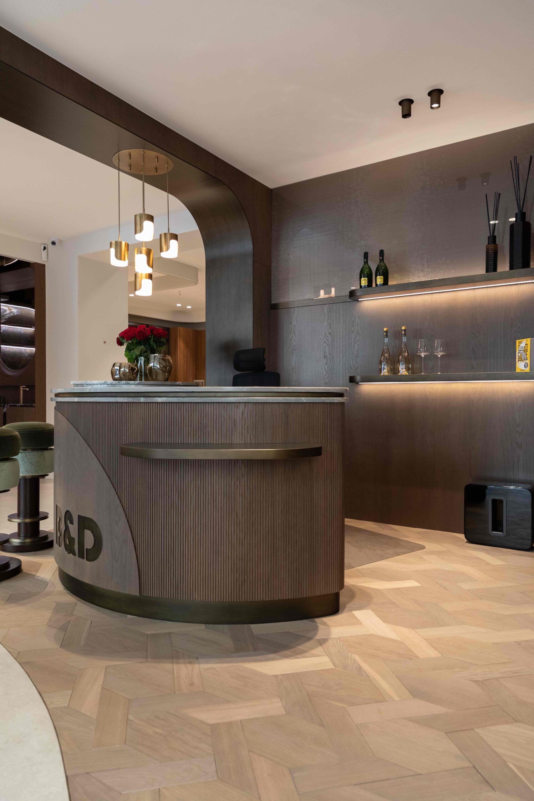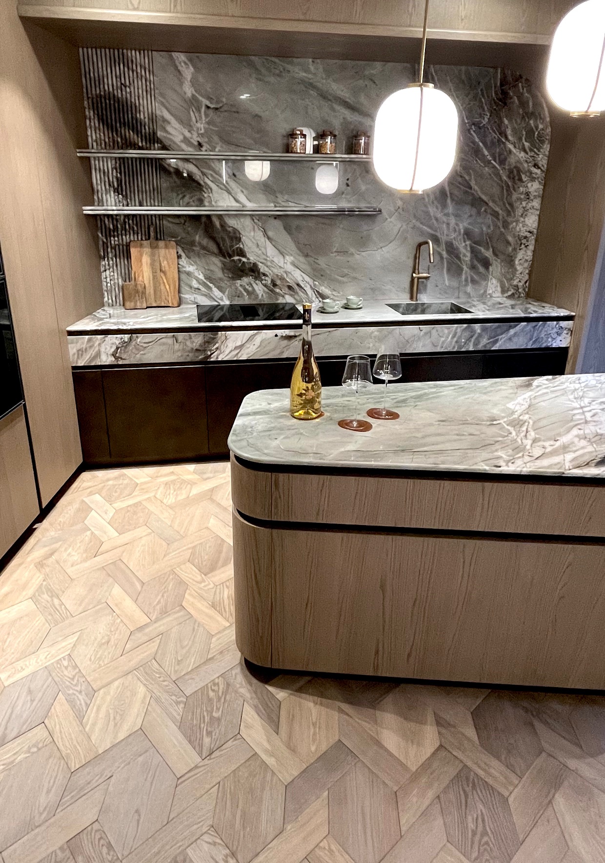 Notre partenaire en intérieurs Bains & Déco, avenue Victor Hugo a fait le choix de présenter ses nouveaux modèles de cuisine en pierre, en associant la chaleur des matières à notre parquet Treccia Sanibel Fumé.